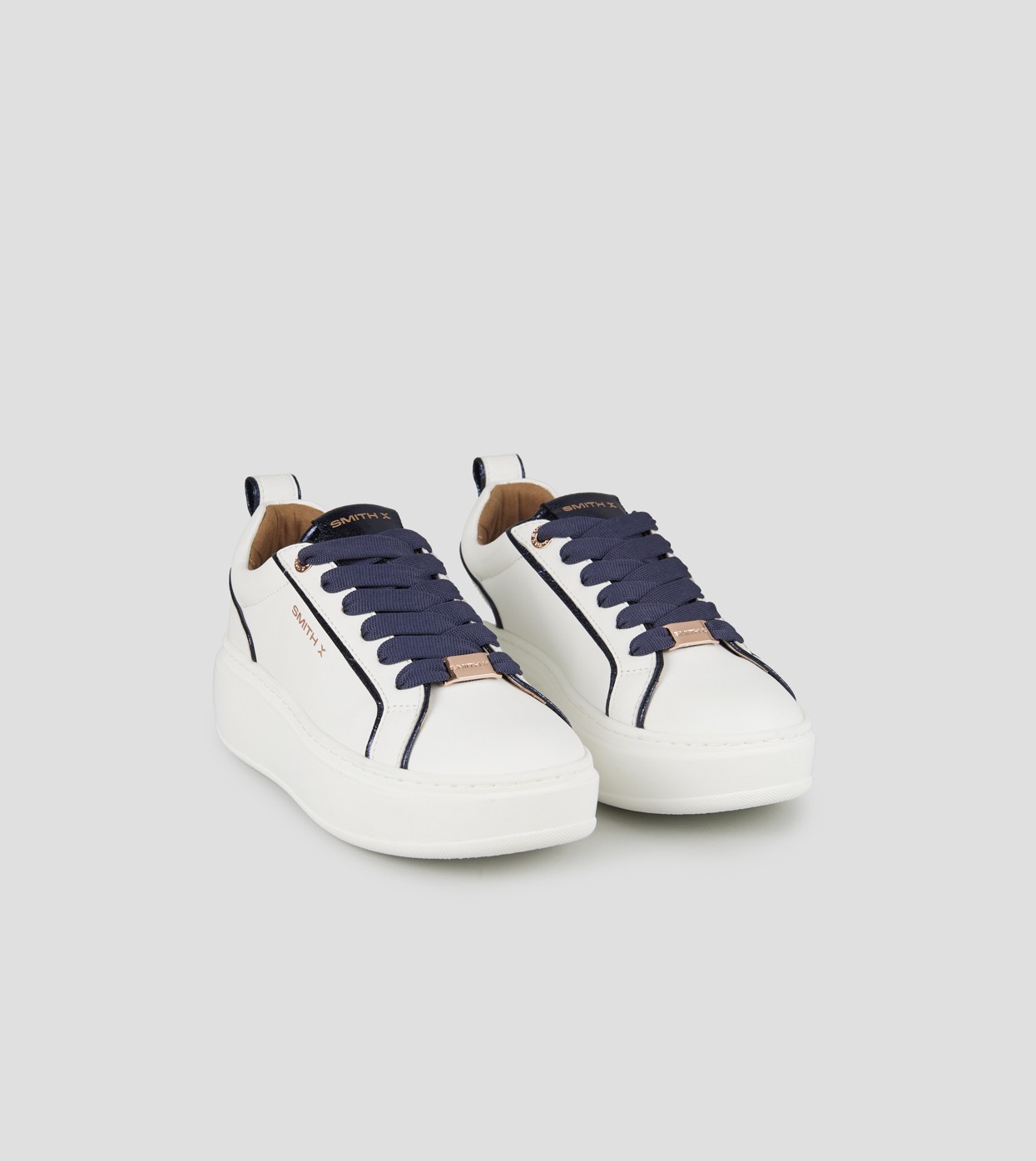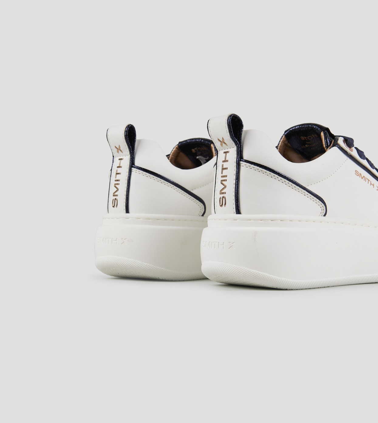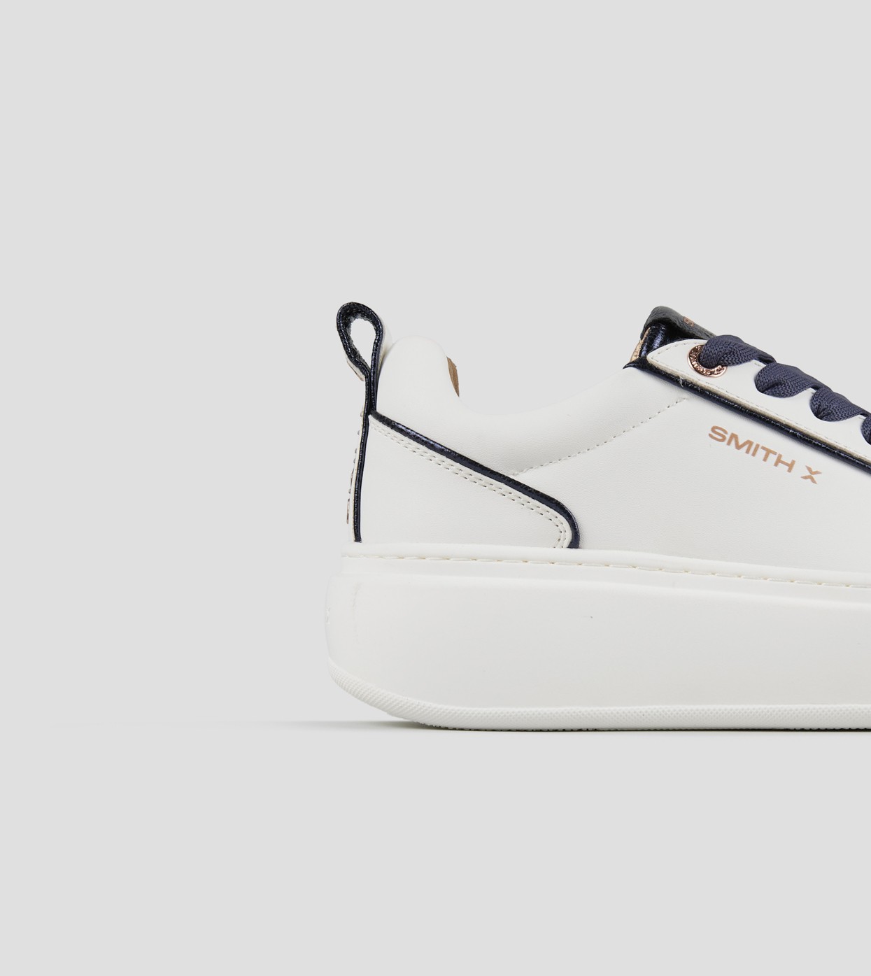 Pulita, lineare, intramontabile. STONE รจ la sneaker minimal firmata Smith X, che unisce spirito urbano e gusto raffinato in un design unisex pensato per durare nel tempo, in questa variante bianca con dettagli in laminato blu.