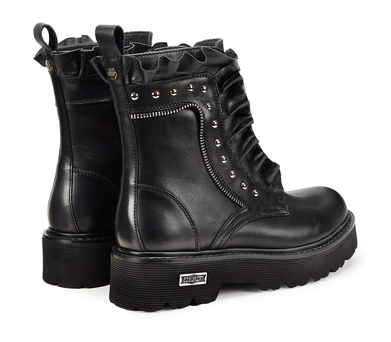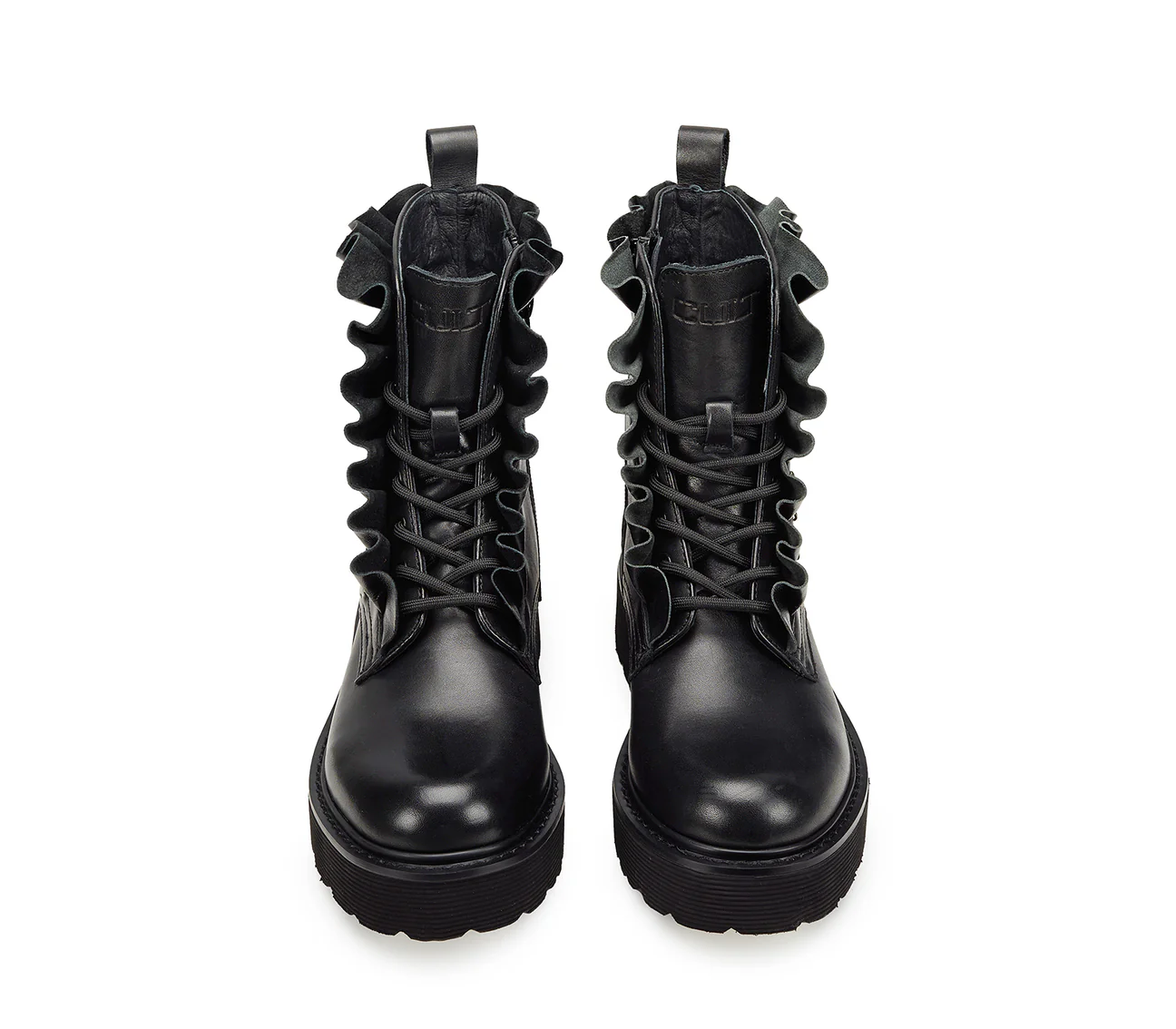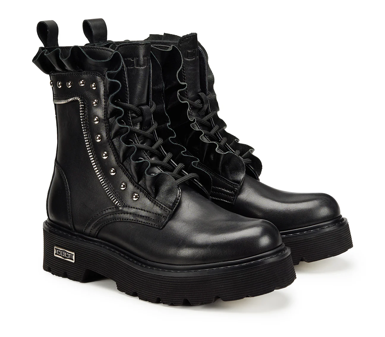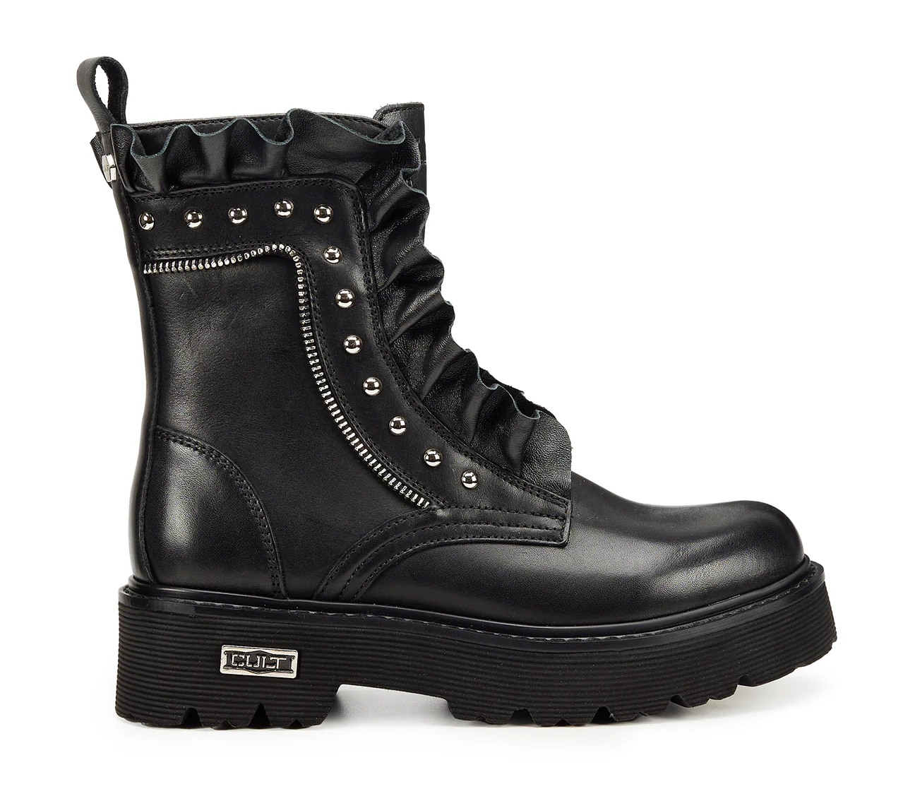 Essenziali e speciali allo stesso tempo, gli anfibi proposti da Cult diventeranno una certezza del vostro guardaroba. La tomaia รจ in liscia pelle nera decorata da iconiche rouches, zip e borchie sferiche per dare una sfumatura decisa ad abiti monocromatici come a pantaloni cropped.