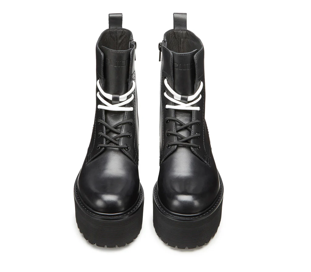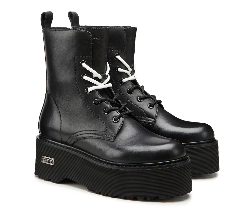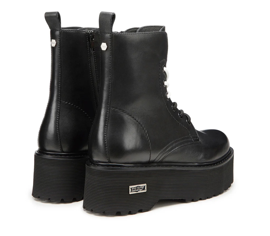 Intramontabili questi anfibi Cult della famiglia AXL. In pelle nera, volumi aumentati con occhielli in metallo e chiusura con stringhe, questi anfibi conferiranno un tocco rock ad ogni vostro outfit.