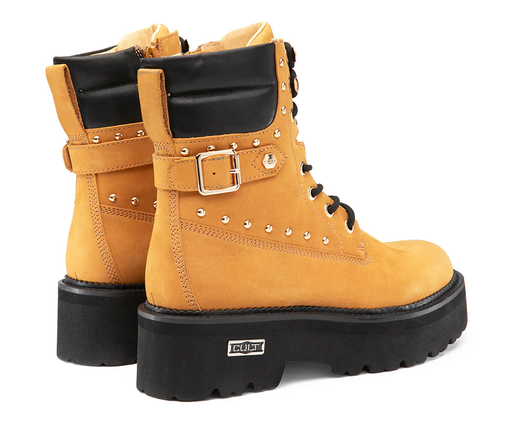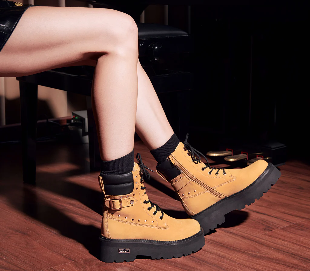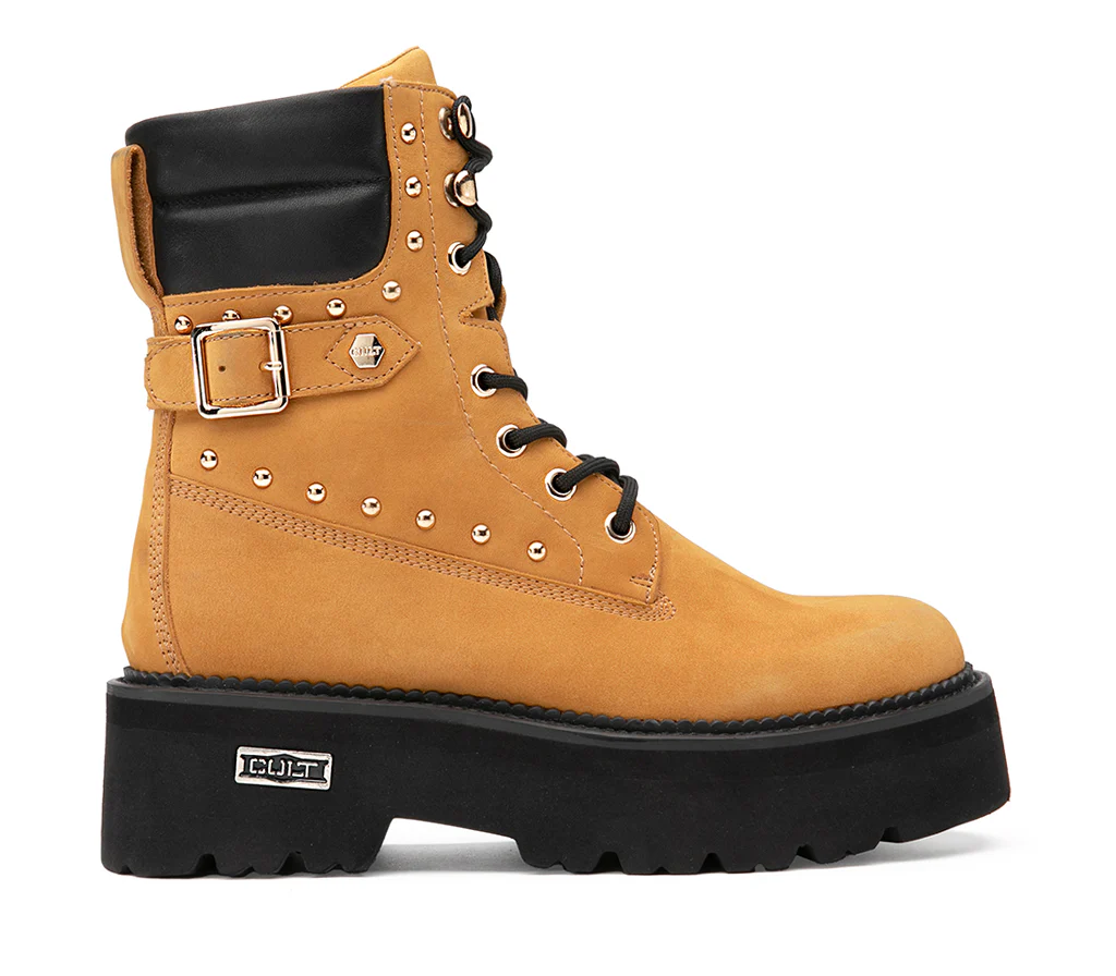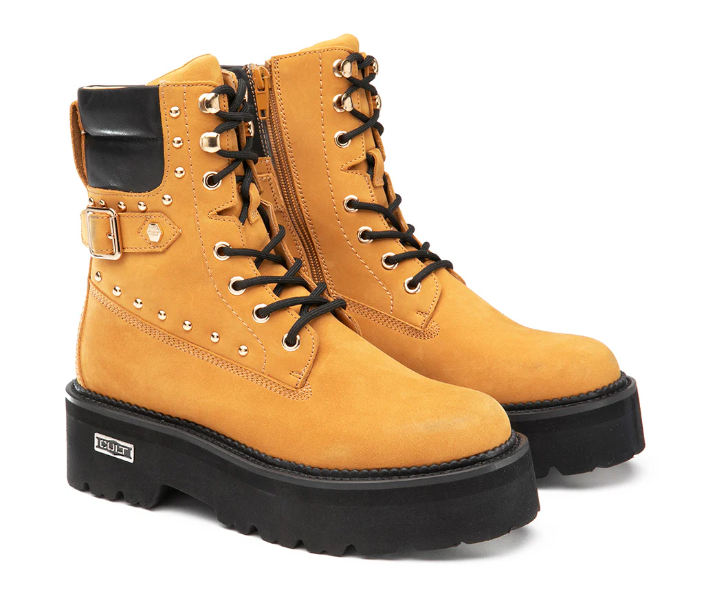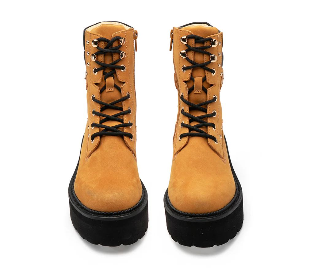 Combat boot in pelle nera liscia, con suola massiccia e dettagli metallici. Una silhouette solida, ispirata al mondo militare, ma reinterpretata in chiave urbana. Decisa, essenziale, senza compromessi.
