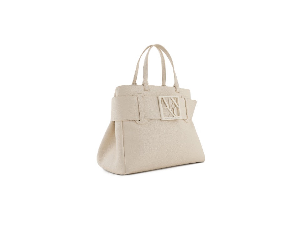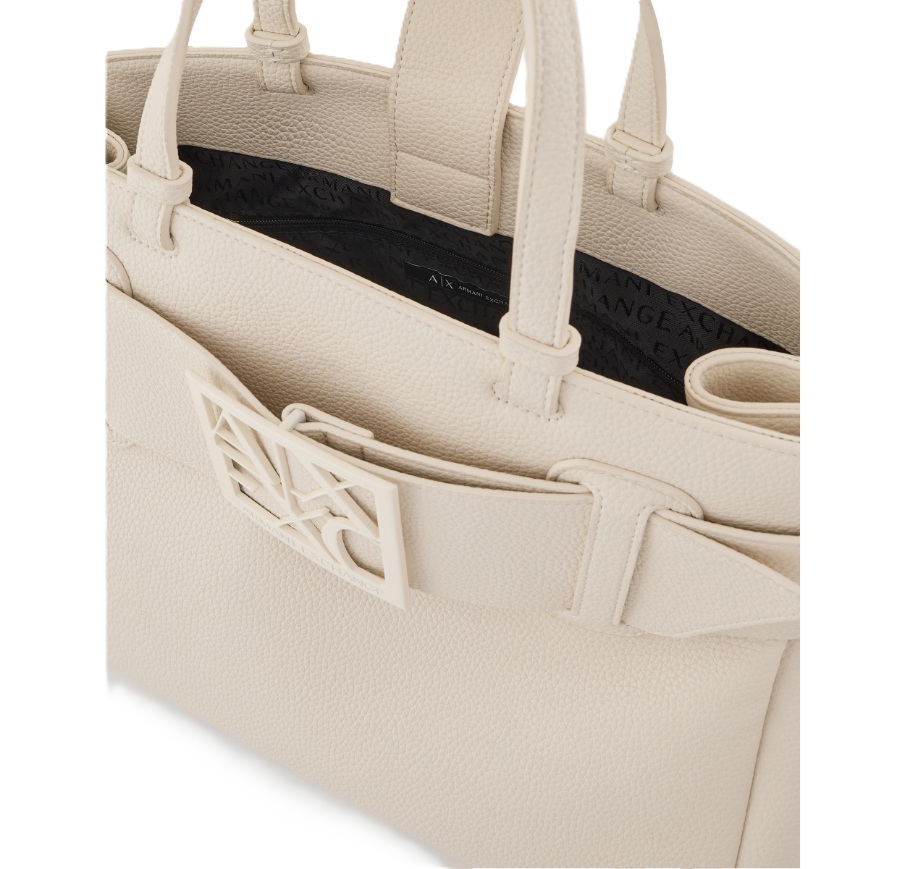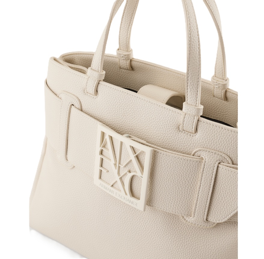 Elegante e capiente, questa borsa Armani Exchange si distingue per il suo design strutturato e raffinato, perfetto per accompagnare i look quotidiani con un tocco sofisticato. Realizzata con finitura effetto pelle dalla texture martellata, è caratterizzata da una fascia frontale con maxi logo AX in rilievo tono su tono, dettaglio iconico che valorizza l’estetica del modello. I doppi manici consentono di portarla comodamente a mano o al braccio, mentre la silhouette ampia la rende ideale per contenere tutto l’essenziale.
