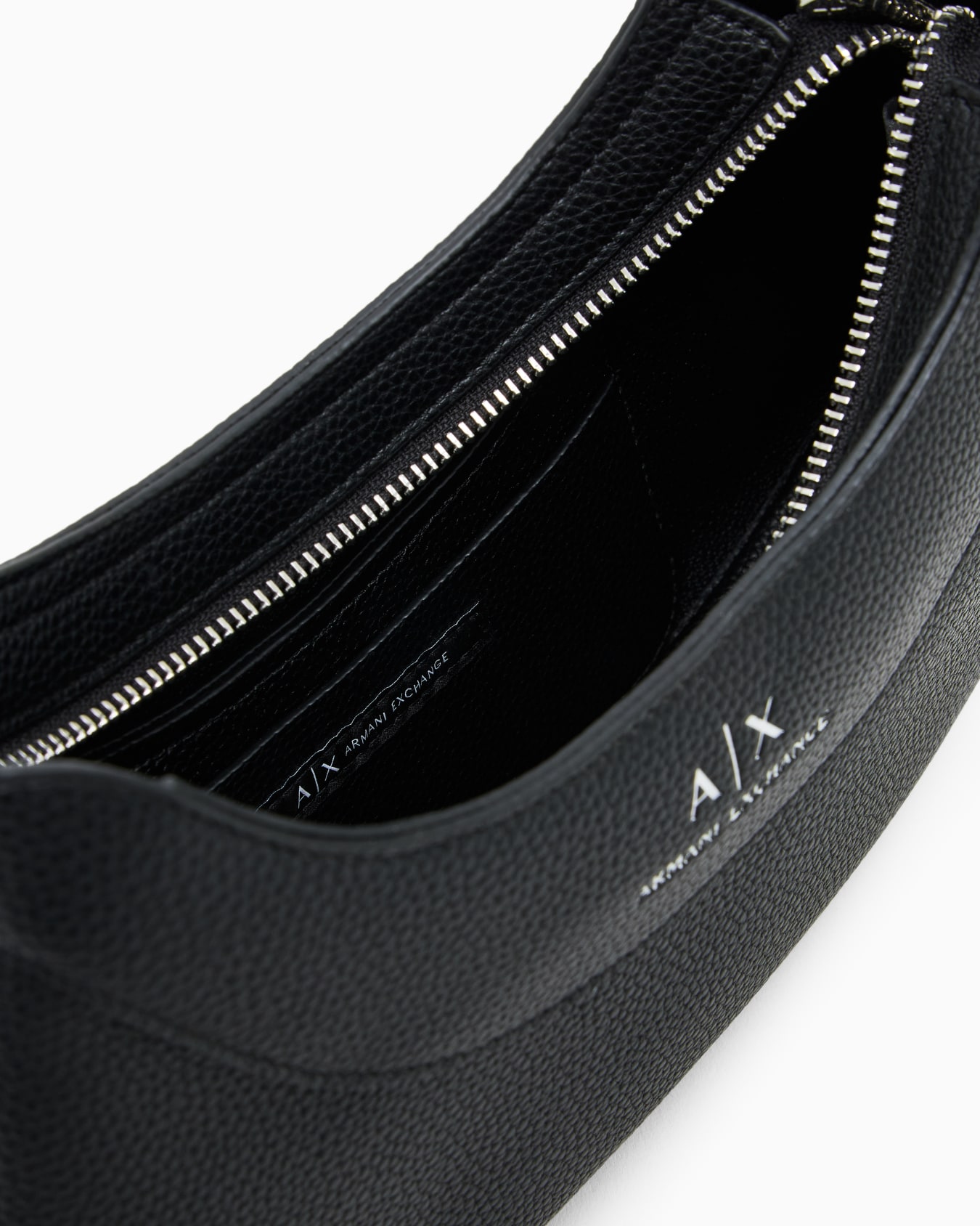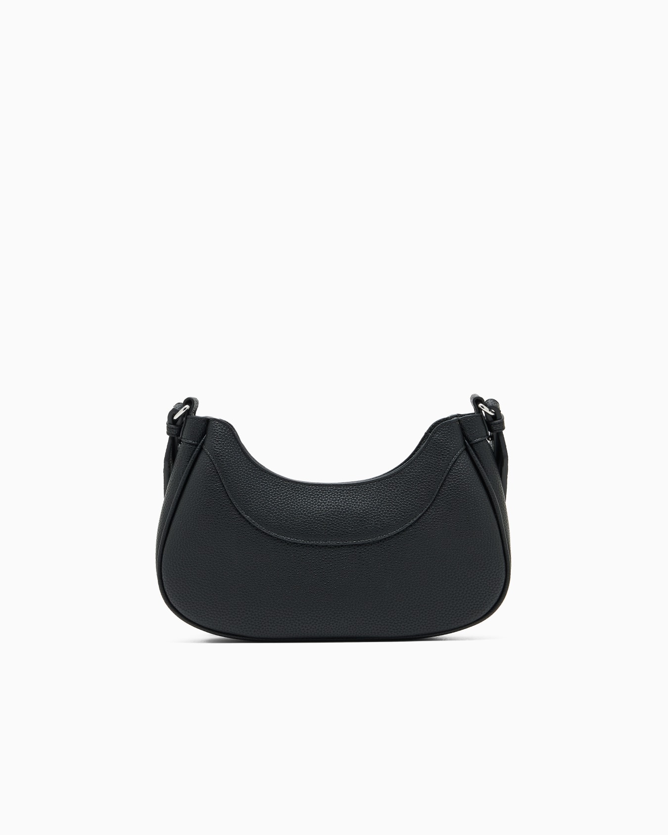 Lavorazione a effetto martellato per la piccola hobo bag con bordi stondati e profilo sagomato. Una borsa discreta ma stilosisssima, personalizzata dalla scritta logo e dalla tracolla a contrasto logata.