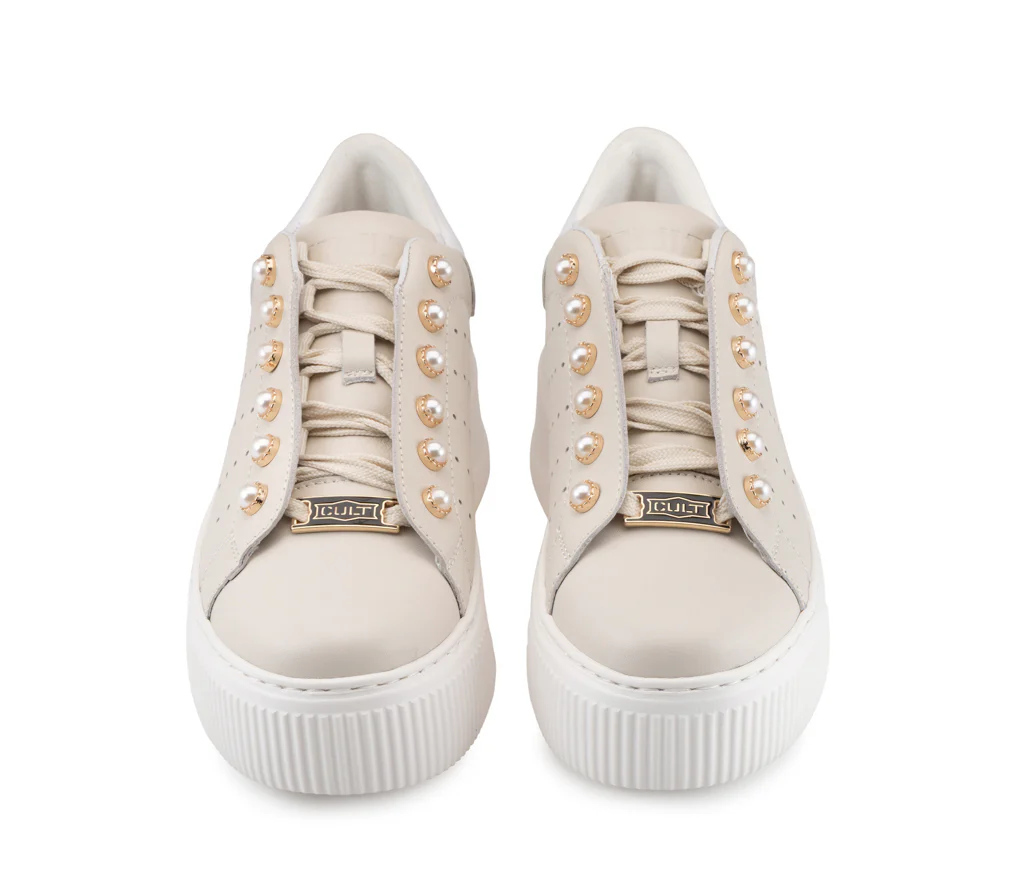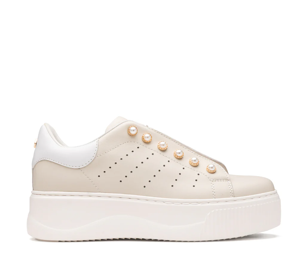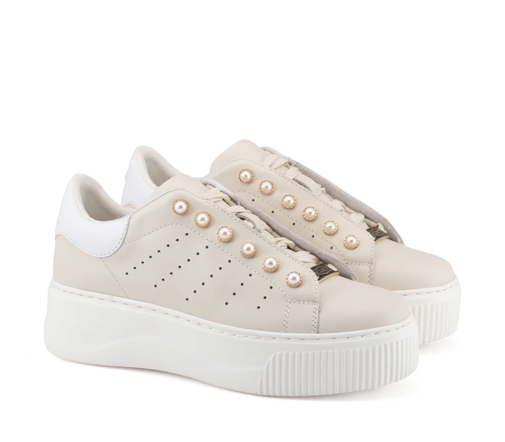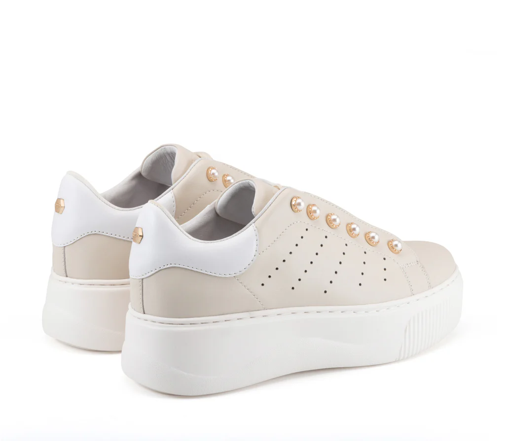 L’eleganza incontra la ribellione: questa sneaker in pelle ridefinisce lo stile glam-rock con dettagli di perle borchiate e una maxi platform decisa. Il perfetto equilibrio tra raffinatezza indipendente e attitudine urban.