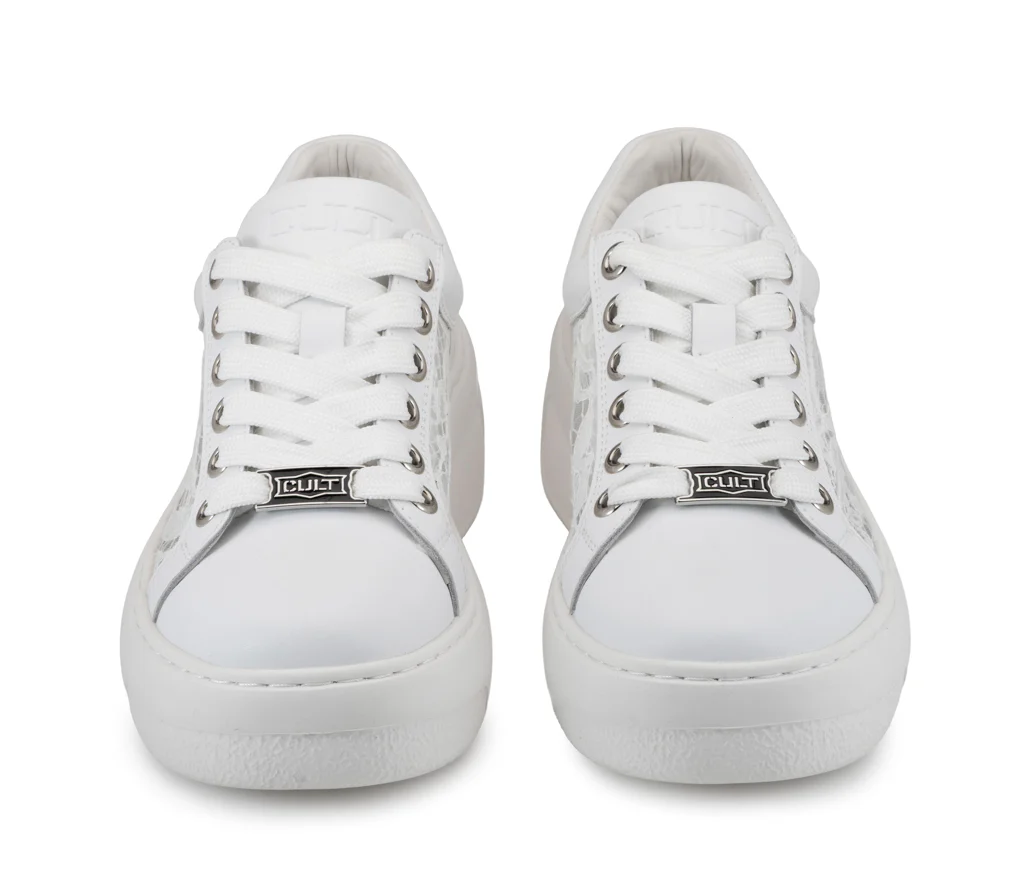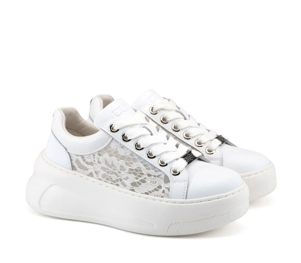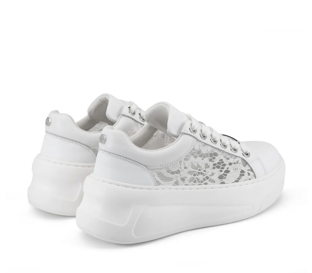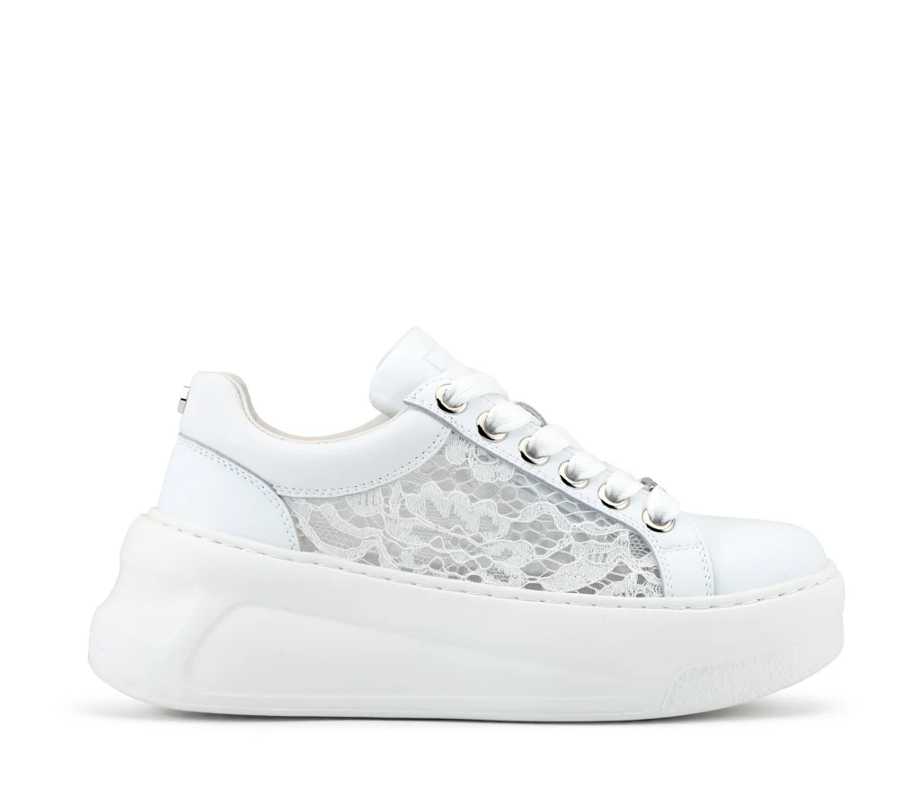 Lโanima rock incontra lโeleganza del pizzo nella sneaker Nirvana: una texture romantica e traforata si fonde alla struttura in pelle total white. La maxi suola platform scultorea e gli occhielli metallici creano un contrasto audace, perfetto per chi vuole unire attitudine rebel e femminilitร .