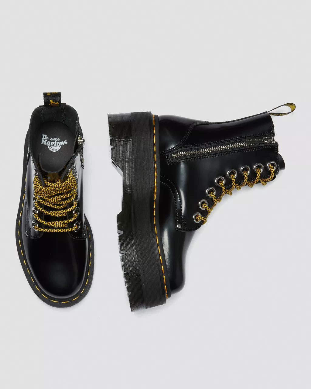 ร arrivato il nostro platform piรน alto ed eccentrico. Con una suola Quad Max di 6 cm realizzata per far sentire chi le indossa come in cima al mondo. Versione aggiornata e a tutto volume della nostra silhouette culto Jadon, questi stivali sono caratterizzati da occhielli oversize e lacci dalle estremitร metalliche. Sono inoltre forniti di una pratica zip centrale per agevolare la calzata, eccezionali lacci giraffati (e un paio nero di scorta) e tutto il nostro classico DNA.