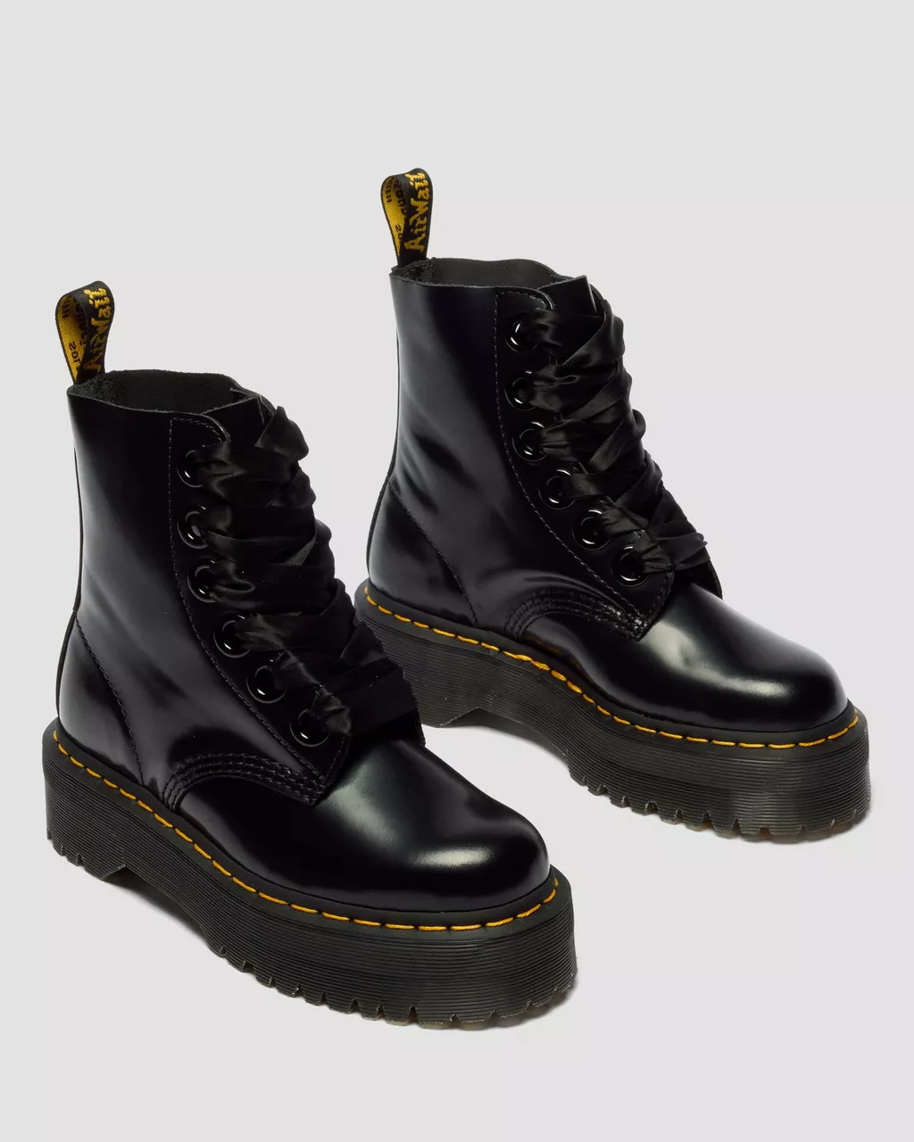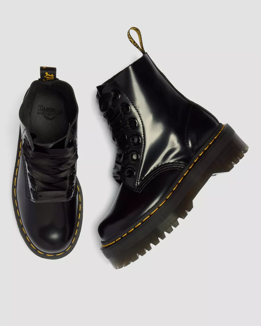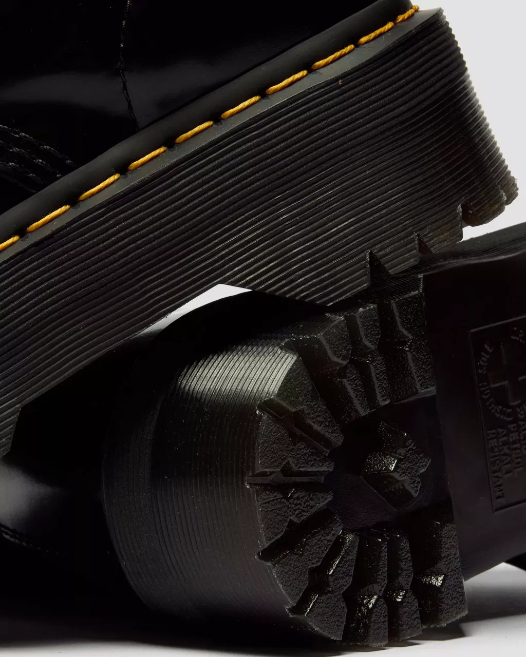- Montati sull’iconica suola a cuscinetto Dr. Martens, resistente a olio, grasso, antiscivolo e antigraffio