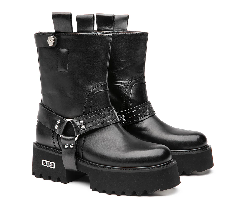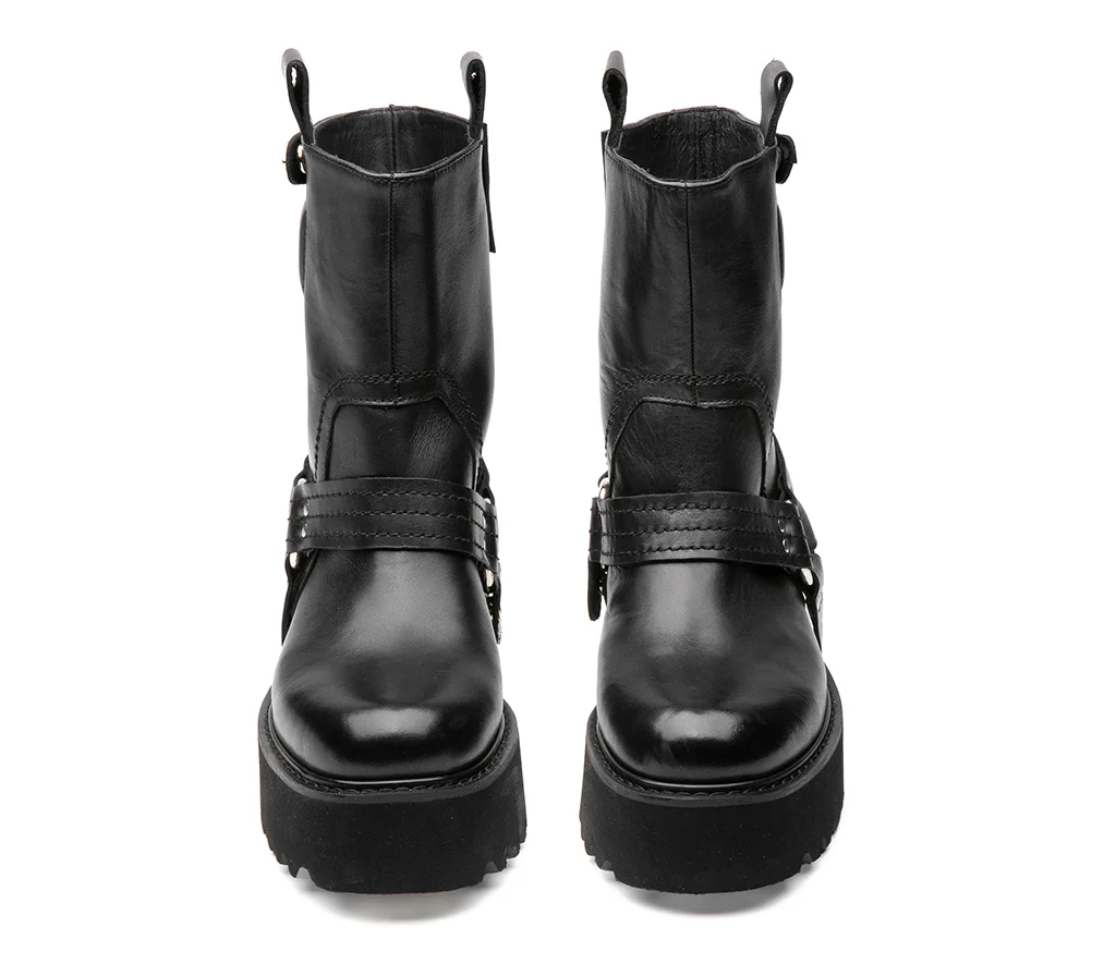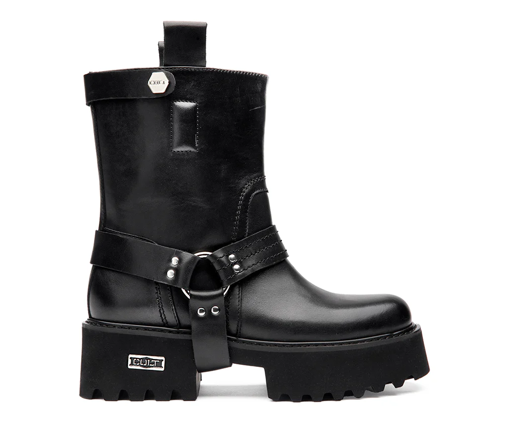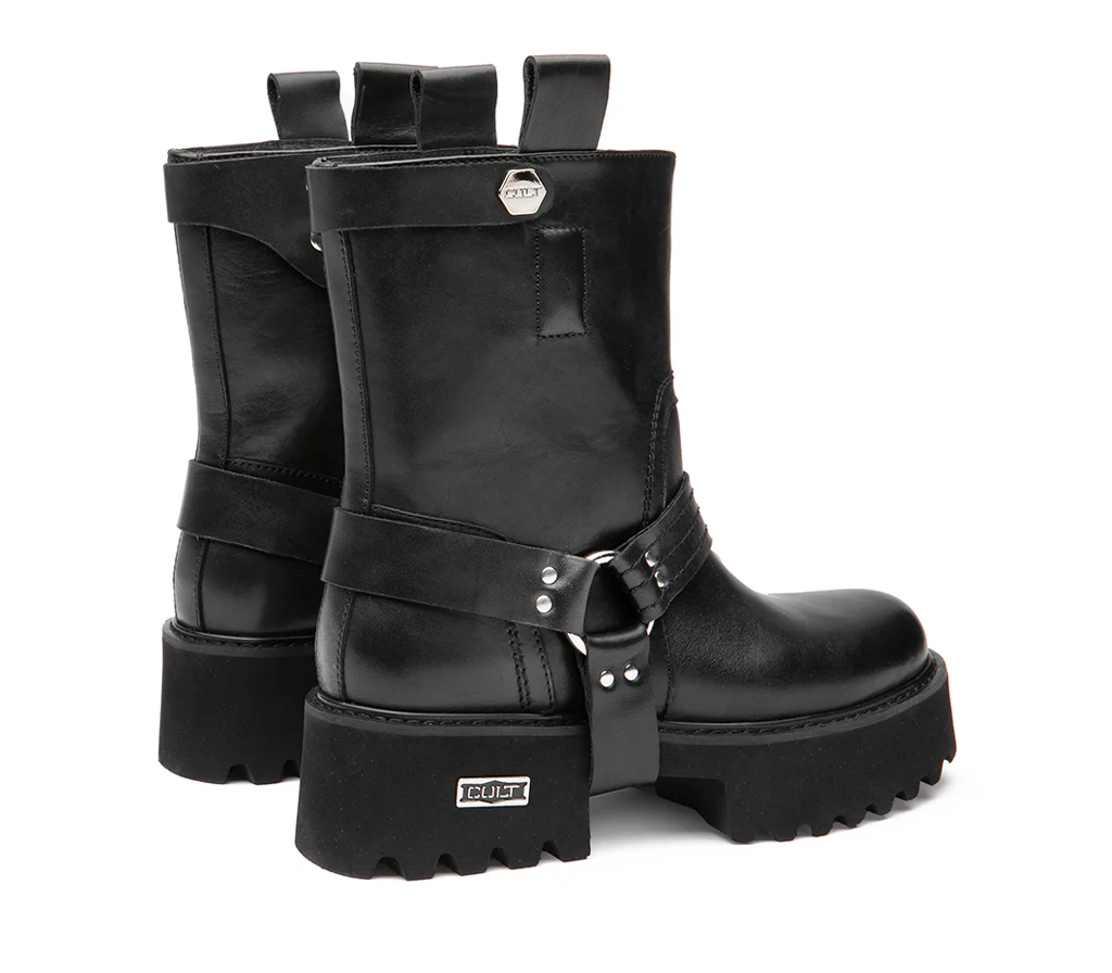 Questo nuovo anfibio CULT รจ il manifesto di unโeleganza alternativa, che osa: realizzato in pelle nera con suola chunky scolpita per il massimo grip, conquista con i suoi dettagli rock. Il cinturino alla caviglia con anello e fibbia metallica aggiunge carattere, mentre la doppia presenza del logo CULT โ inciso su piastrina laterale e sul bullone del cinturino superiore โ ne sottolinea lโidentitร grintosa e riconoscibile. Altezza tacco 5 cm.